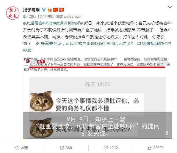 南京一位95后员工在网上发帖,说自己去机场接客户回公司和老板开会,为了不耽误开会时间,带了客户坐地铁,客户也觉得满意,结果被老板怒斥“不带脑子”。