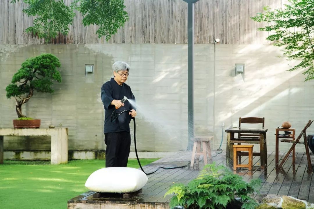 我几乎每天都一个人来这里,进来以后就不说话,因为很安静,只有风声、水声和我家小狗的叫声。不用工作的时候,我会在这里修剪花花草草、喂鱼、和小狗玩耍,直到满身大汗。之后就会去洗个澡,到二楼点个香,喝茶,去体会真正的生活是什么。