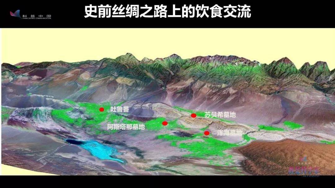 这幅地图就是著名的吐鲁番盆地,上面绿色的部分是天山,而下面这一片光秃秃的是著名的火焰山。火焰山的周边发现了早期铁器时代的苏贝希墓地跟洋海墓地,距今2300~2900年之间。