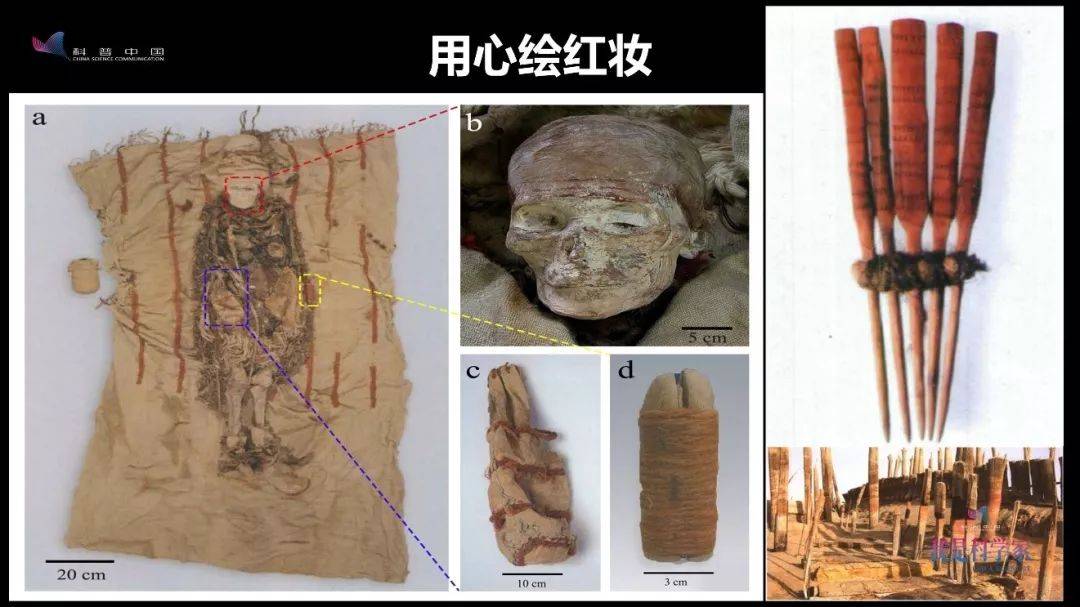 十几年前,新疆考古所的考古学家在发掘小河墓地的时候,发现干尸保存得非常好;而且女性干尸的旁边往往陪葬着皮囊(即今天的小皮袋),里面会有一些棒状物。棒状物的上面有一层红色颜料,所以考古学家就推测是不是跟化妆有关系。