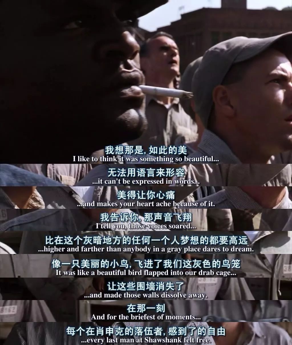 比如我年轻时看,激动于安迪越狱成功后在滂沱大雨中体会自由的场景,如今再看,最被打动的情节,变成了安迪将自己反锁在狱长办公室里,通过广播给犯人们播放《费加罗的婚礼》——他的脸上露出奇异而满足的笑容,就像在屋顶看众人喝啤酒时他露出的那样。