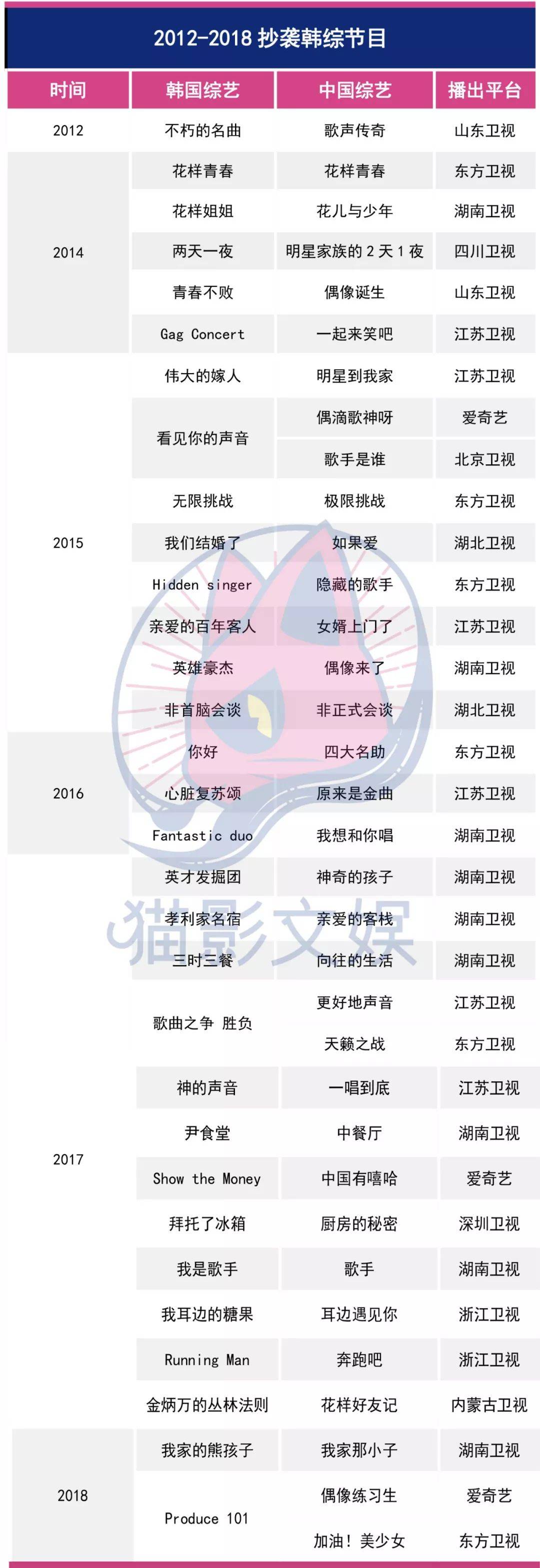 抄袭《无限挑战》的《极限挑战》,抄袭《三时三餐》的《中餐厅》,抄袭《英雄发掘团》的《神奇的孩子》,抄袭《Show Me The Money》的《中国有嘻哈》……