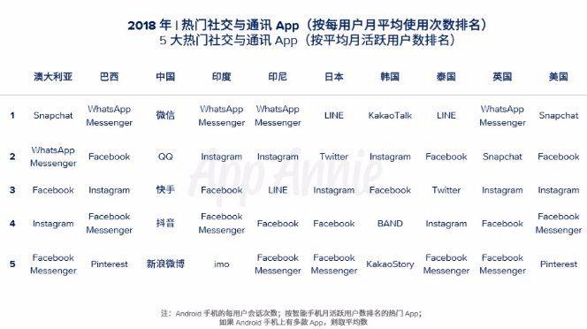 图片说明:2018年主要国家热门社交与通讯App,图片来源:App Annie