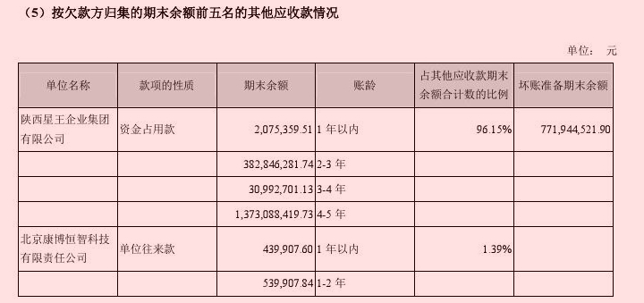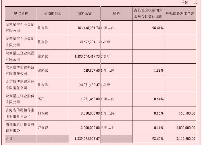 比如st华泽,2015年年报显示其他应收款余额高达18.62亿元,当年净资产不过12.57亿。查看明细发现,几乎全部是应收陕西星王企业集团有限公司的款项,其中13.84亿的余额账龄为2-3年了,星王企业集团有限公司就是华泽钴镍的大股东,实际控制人。