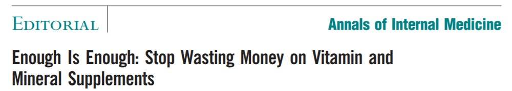 一篇发表在《内科医学年刊(Annals of Internal Medicine)》的题为“Enough Is Enough: Stop Wasting Money on Vitamin and Mineral Supplements”的社论中[1],约翰斯·霍普金斯大学的研究人员总结了关于复合维生素的研究,其中包括三项较新的研究: