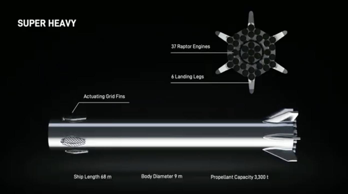 MK1配备3个猛禽(Raptor)发动机——猛禽是一种全流量、多级燃烧型火箭发动机,由低温甲烷和液氧作为燃料。而运送星际飞船的超级重型火箭Super Heavy拥有 37个猛禽发动机,6 条着陆腿,长度68米,直径9米。每个猛禽发动机的推力高达200吨,因此发射时火箭的总推力将达到7400吨,是此前人类历史上推力最大的“土星5号”火箭3500吨的推力的2倍多。