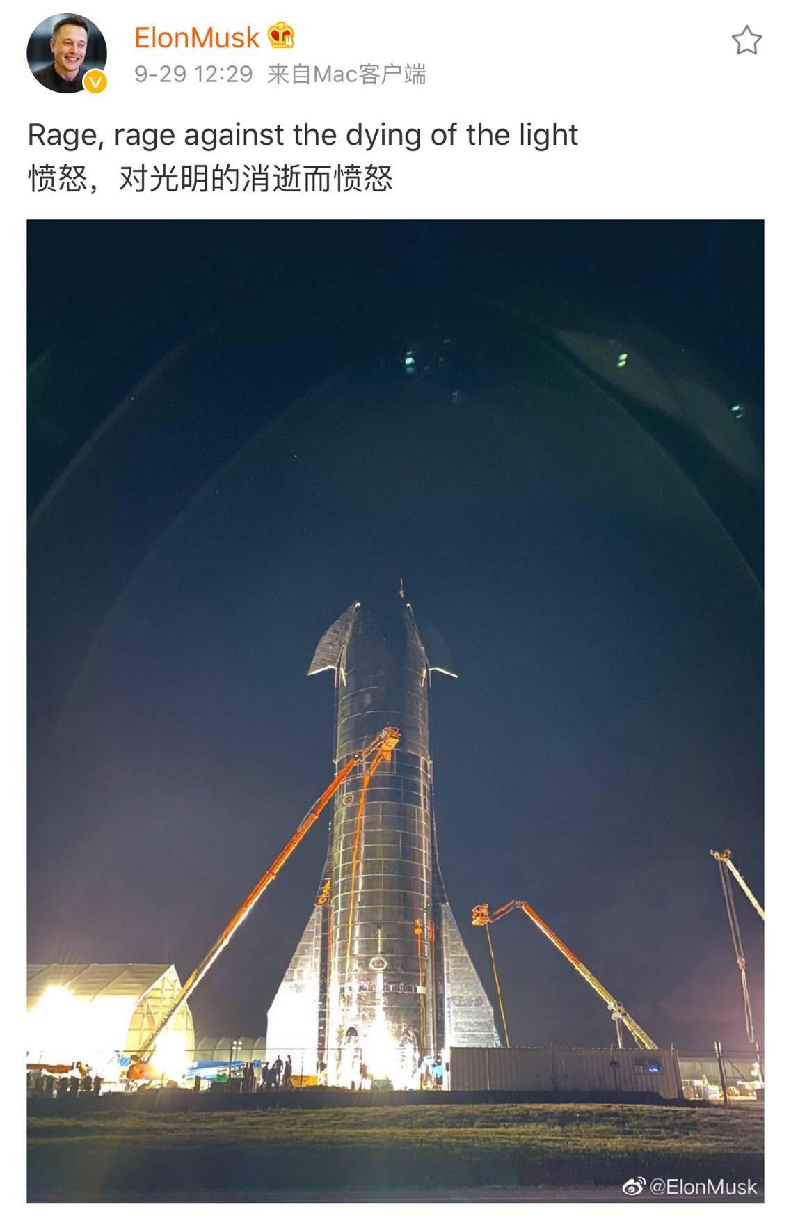 在此之前,马斯克已经在其个人Twitter和微博账号上按耐不住亢奋地进行了好几天的风骚造势,比如其微博从9月23日到9月27日,连发7条微博,内容全是Starship的,每次只发一个局部,撩拨每个人的好奇心——