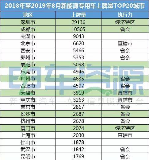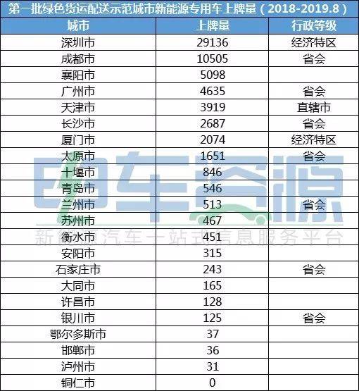 电车资源根据2018年至2019年8月的新能源专用车上牌量数据,将22个第一批城市绿色货运配送示范工程城市(以下简称“第一批名单”)进行排序,总销量为63608,其中深圳市共计上牌量为29136,以45.8%的占比位列第一批名单头把交椅。第二为成都,上牌量为10505,占比16.5%。22个城市中有七座省会城市,两座经济特区和一座直辖市。