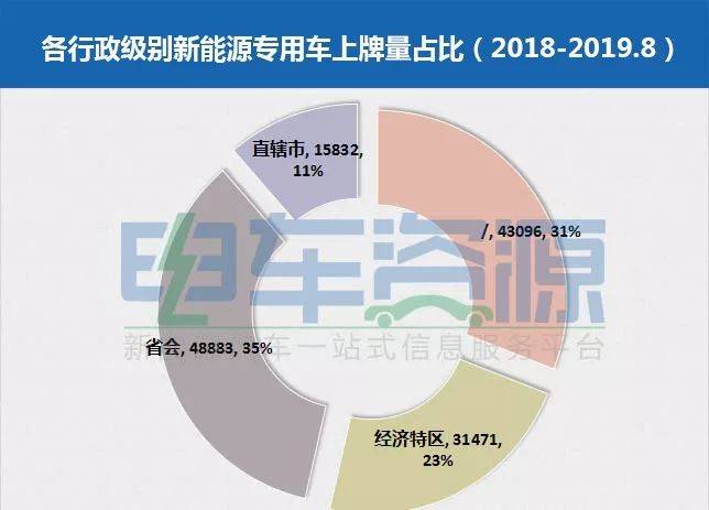 上图为2018年至2019年8月新能源专用车上牌量的行政区级占比,有数据的省会城市(包括海南省省会)、经济特区(其中海南省除省会外不纳入经济特区进行比较)、直辖市共计35座城市,占了有上牌量的城市的14%,却提供了七成的上牌量。