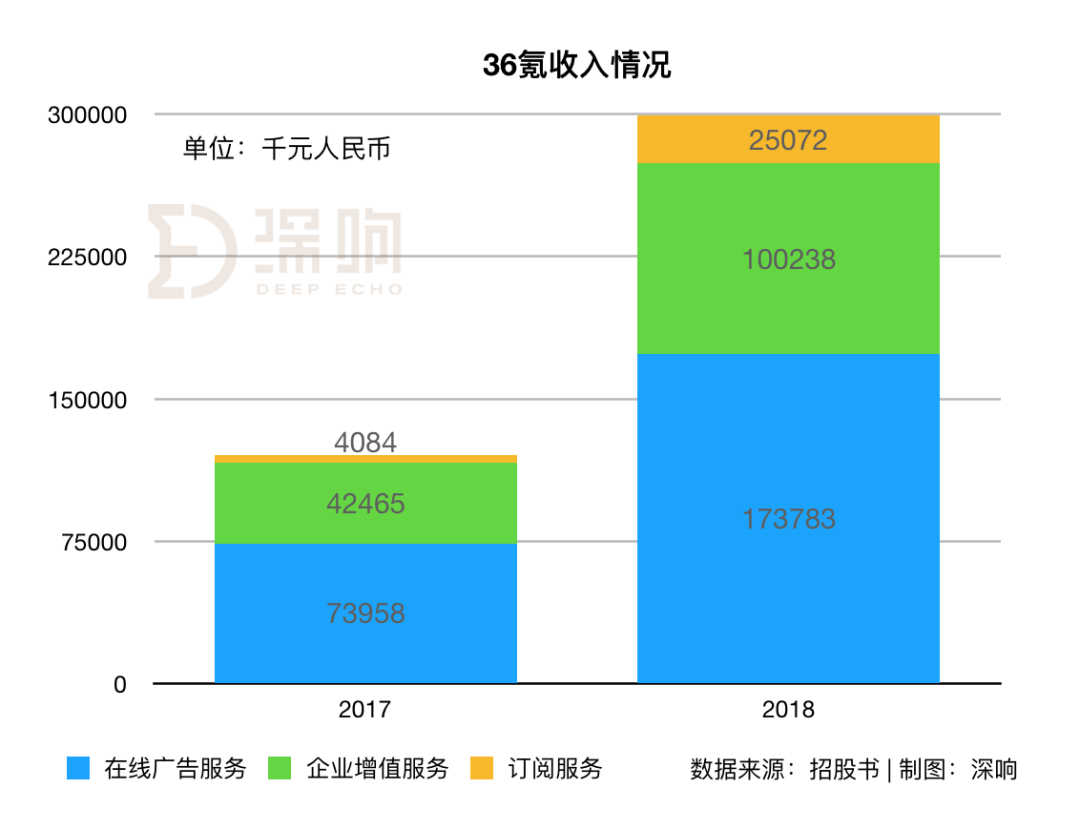财务数据上,36氪在2018年取得营业收入2.99亿元人民币,相较于2017年的1.21亿元增长148%,其中线上广告业务收入为1.74亿元人民币,企业增值服务收入1亿元人民币,订阅服务收入2507万元人民币。