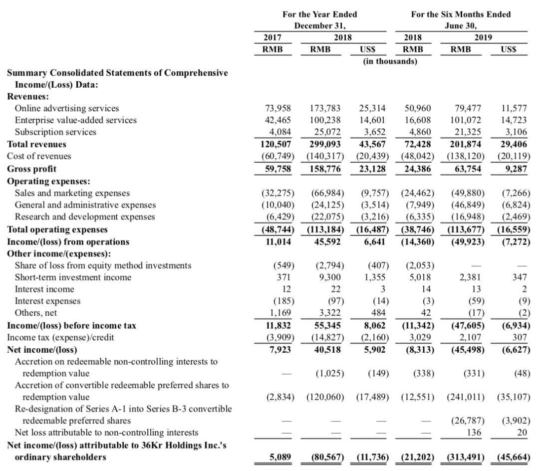 招股书显示,36氪在2018年营收2.99亿元人民币,净利润4051.8万元。