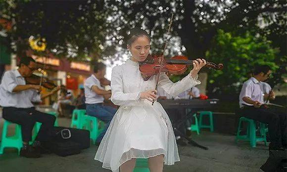 简单商量几句之后,乐队开始表演。电子琴手奏起前奏,低音提琴沉郁的弦音纵贯银沙路社区广场,二胡四人联弹为曲目涂上厚重的底色。临时演奏相当精彩。