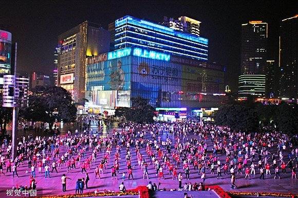在观音桥跳《小苹果》广场舞的重庆居民,红鼎国际也在这个商圈。图片来源:视觉中国