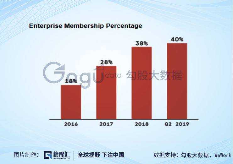 为了减少租赁的风险,WeWork开始购买房产,开始接受租赁期限更长的租客。WeWork的企业会员数在2018年达到40万,企业会员占比38%,今年二季度这个数字是40%。