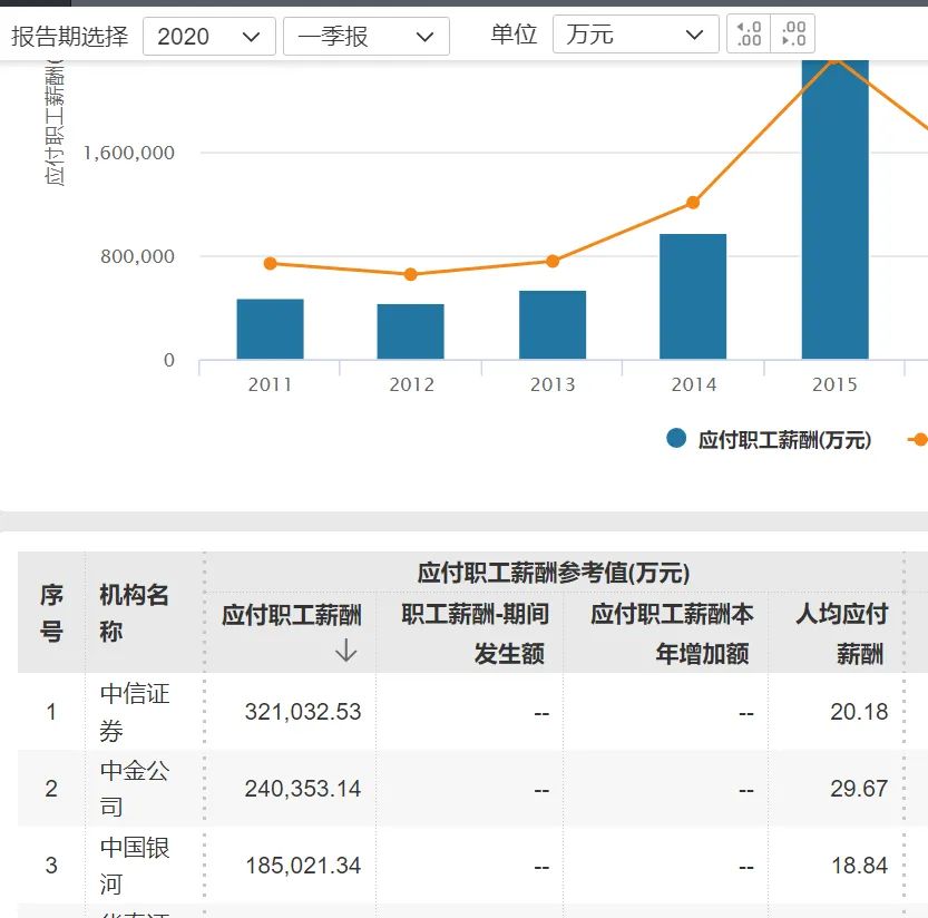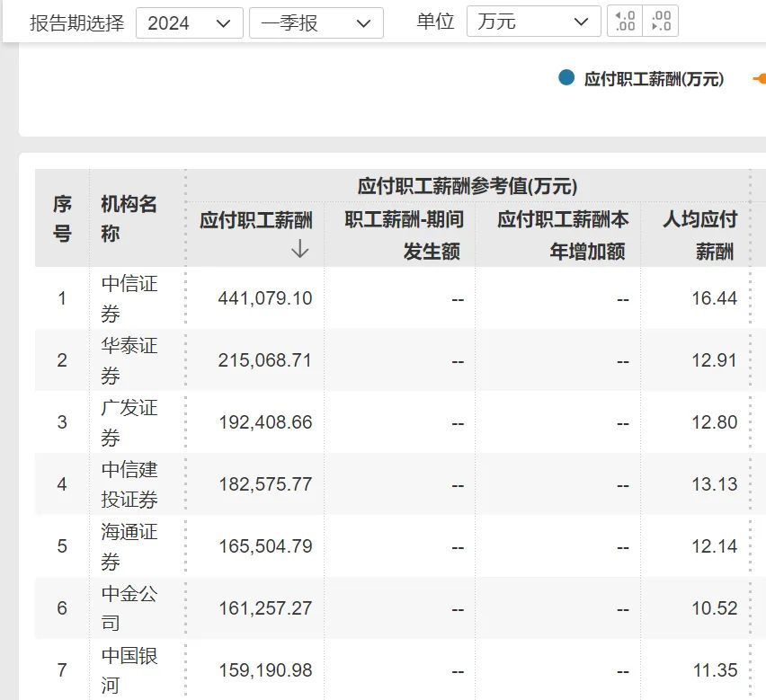 Wind金融终端按照一季报估算,一季度中金公司人均应付薪酬约为10.52万元,而2023年同期为16.64万元,同比降幅为36.78%。