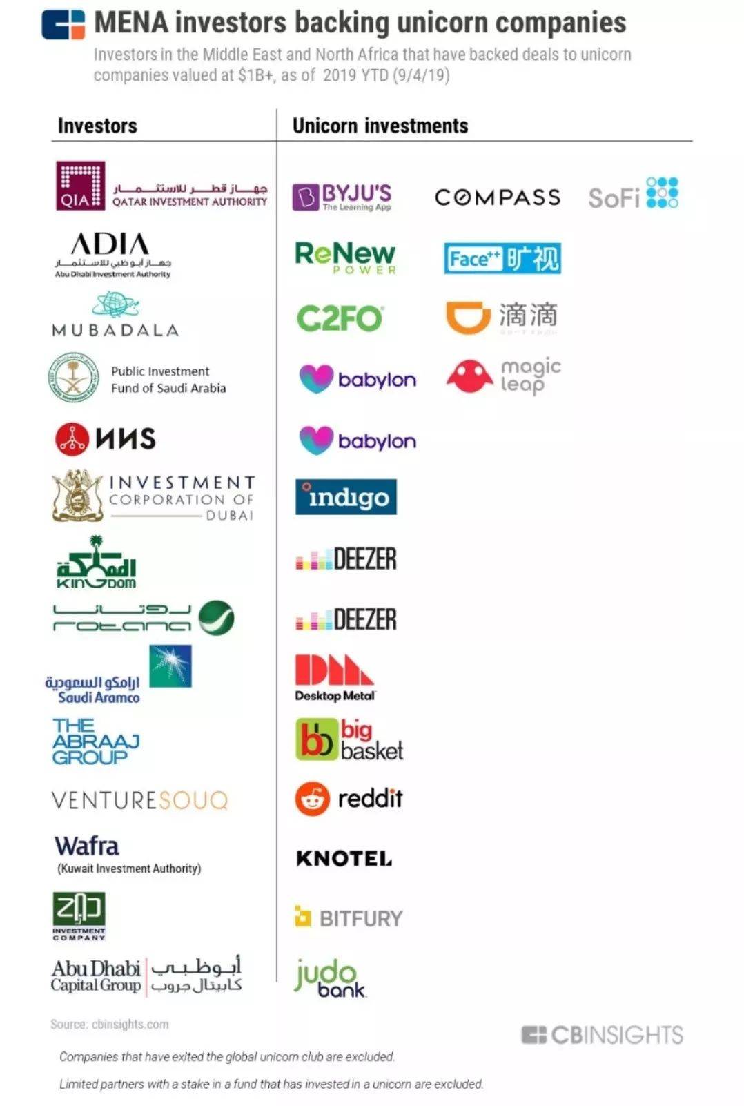 其次,中东本土的创业氛围并不是那么浓厚,早期风险投资也不那么活跃。相反,主权基金以及企业投资在中东更为主动,也在世界范围内参投了不少独角兽。
