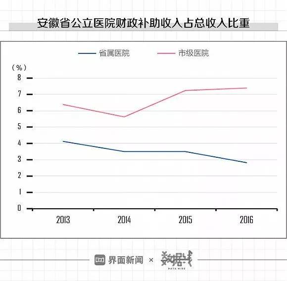界面新闻查阅到的多篇文献显示,中国财政补助占公立医疗机构收入的比重在10%以下。 根据《安徽省属公立医院补偿机制研究》的数据显示,安徽省省属医院的财政补助收入占医院总收入比重逐年下降;市级医院的财政收入占比则有所上升, 但依旧在10%以下。