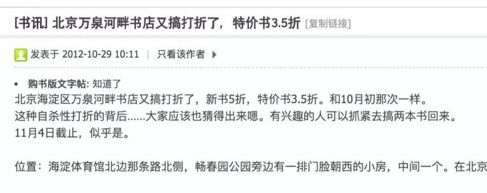 关店似乎是注定的,早在2012年,万泉河畔书店就推出新书5折,特价书3.5折的销售策略。