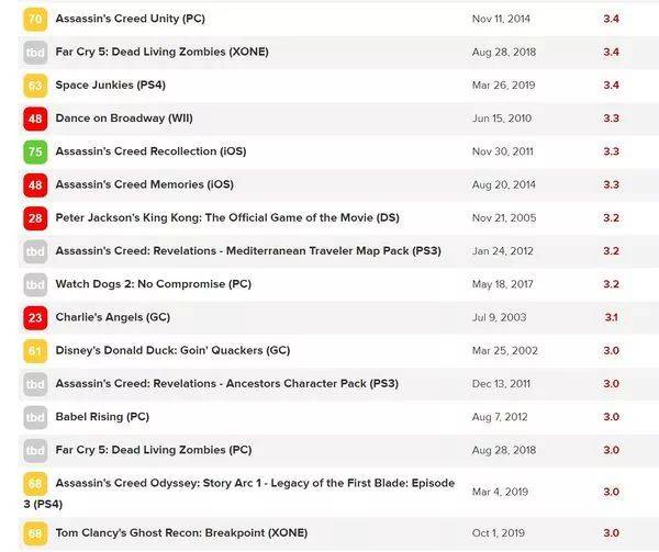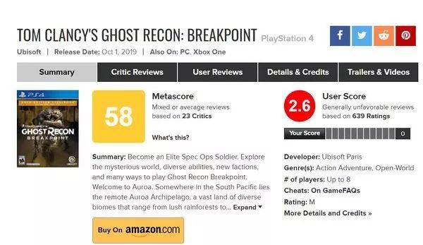 国外媒体VG247率先给《幽灵行动:断点》打出了20分(满分一百分)的超低分,随后著名游戏媒体Gamespot给出了4分(满分10分)的临时评分。同时,在Metacritic评分榜上,本作用户评分仅为3.0分(满分10分),甚至低于因Bug而出名的《刺客信条:大革命》——这也是作为“开放世界”游戏专业户育碧近几年来遭遇的一次大“翻车”。