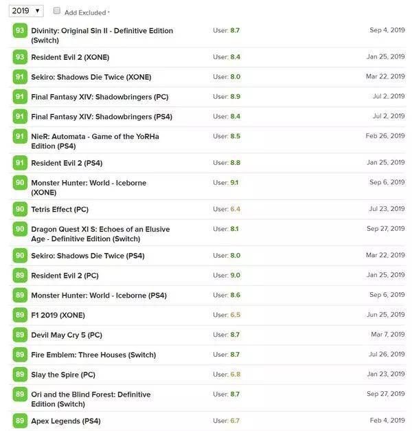 在已经过去九个月的2019年,代表了欧美主流评价体系的Metacritic评分榜上,除了欧美传统角色扮演游戏《神界:原罪2》Switch版仍稳居第一以外,评分榜前排几乎被日本游戏厂商的作品占领。