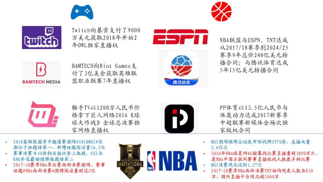 不过对比传统体育,如NBA联盟与ESPN、TNT的9年转播合同总价值高达240亿美元,以及腾讯以5年5亿美元的价格拿下了NBA新媒体版权,电竞赛事的转播价格依然存在非常大的成长空间,未来赛事变现潜力巨大。