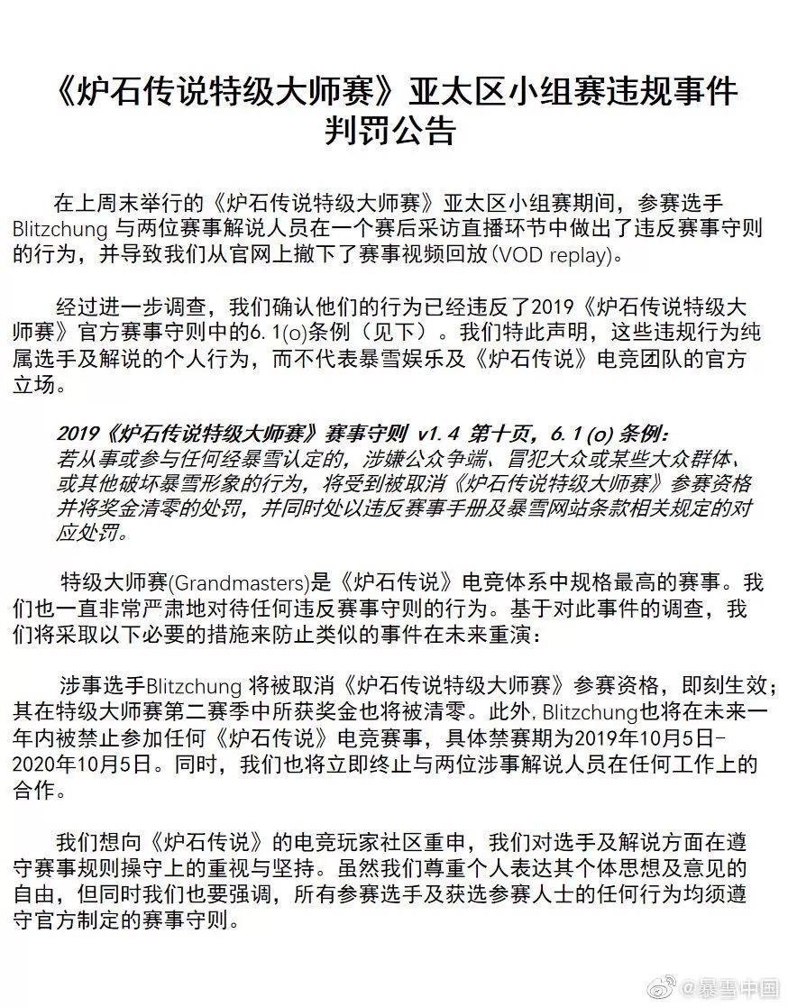 就在NBA事件闹得沸沸扬扬之时,昨天晚间,包括"共青团中央"在内的微博官号们齐刷刷的转发了另一个公告——那是美国著名游戏公司暴雪针对“炉石传说特级大师赛”选手不当言论的处理。