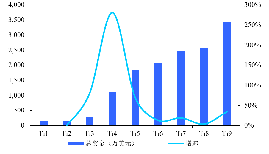 Ti3举行时总奖金仅为286万美元,到了Ti9,已跃升至3429万美元。于是,Ti成为不靠赞助商与版权出售,仅靠玩家创造出一个赛事奖金神话。