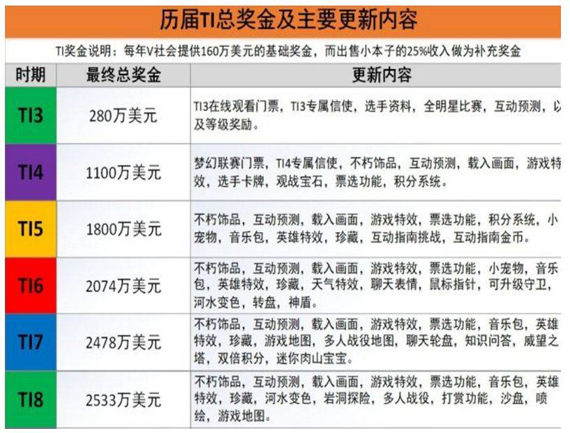 2013年Ti3时,VAVLE定下奖金分配机制。每届Ti前《Dota2》游戏中均会推出“勇士令状”(玩家称“本子”),玩家可以通过充值购买游戏内的各种服务来为勇士令状升级,VAVLE将每年勇士令状25%的收入投入Ti赛事总奖金。