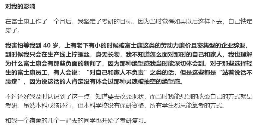 十年后的今天,随着这些热议退散,富士康也慢慢回归“沉寂”。偶尔能在知乎这样的网络社区里看到一些它的踪迹,比如一位叫“李狗嗨”的用户记录了下了他在富士康工作的两个月生活,这段“无望”的生活让他发奋考研,如今他已经是哥伦比亚大学的机械工程博士。但大部分答案更像是主动迎合大众的想象:流水线黑白两班倒,每次持续10个小时,除加班拿钱,这里的工人没任何追求。