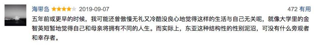 “五年前或更早的时候,我可能还曾傲慢无礼又冷酷没良心地觉得这样的生活与自己无关呢,就像大学里的金智英短暂地觉得自己和母亲将拥有不同的人生。而实际上,东亚这种结构性的性别泥沼,可没有什么旁观者和幸存者。”(via@海带岛)