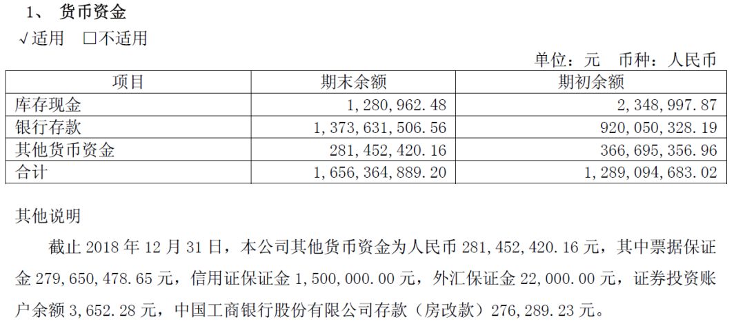 第一步,看辅仁药业主要科目的期末余额情况,包括货币资金、其他应收款、其他流动资产、借款、其他应付款等。辅仁药业2018年货币资金余额16.56亿元,其中其他货币资金余额2.81亿元。