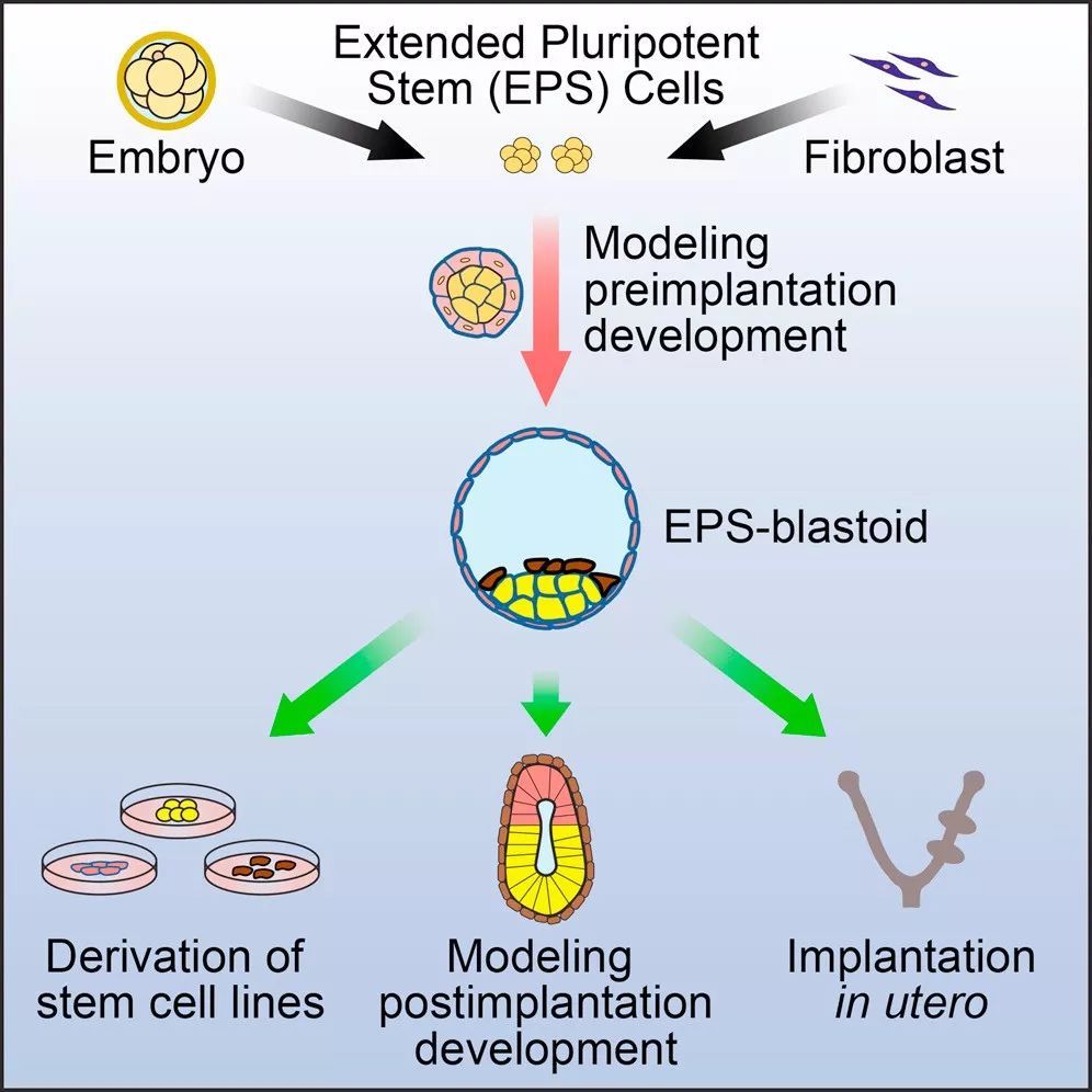 具体来看,这支研究团队使用小鼠的胚胎细胞或成熟细胞,分化出了一种叫做“潜能扩展多能干细胞”(extended pluripotent stem cells,缩写EPS细胞)的特殊干细胞。几年前的一篇《细胞》论文指出,这类干细胞几乎能发育成小鼠胚胎的所有细胞类型,有着很高的应用价值。