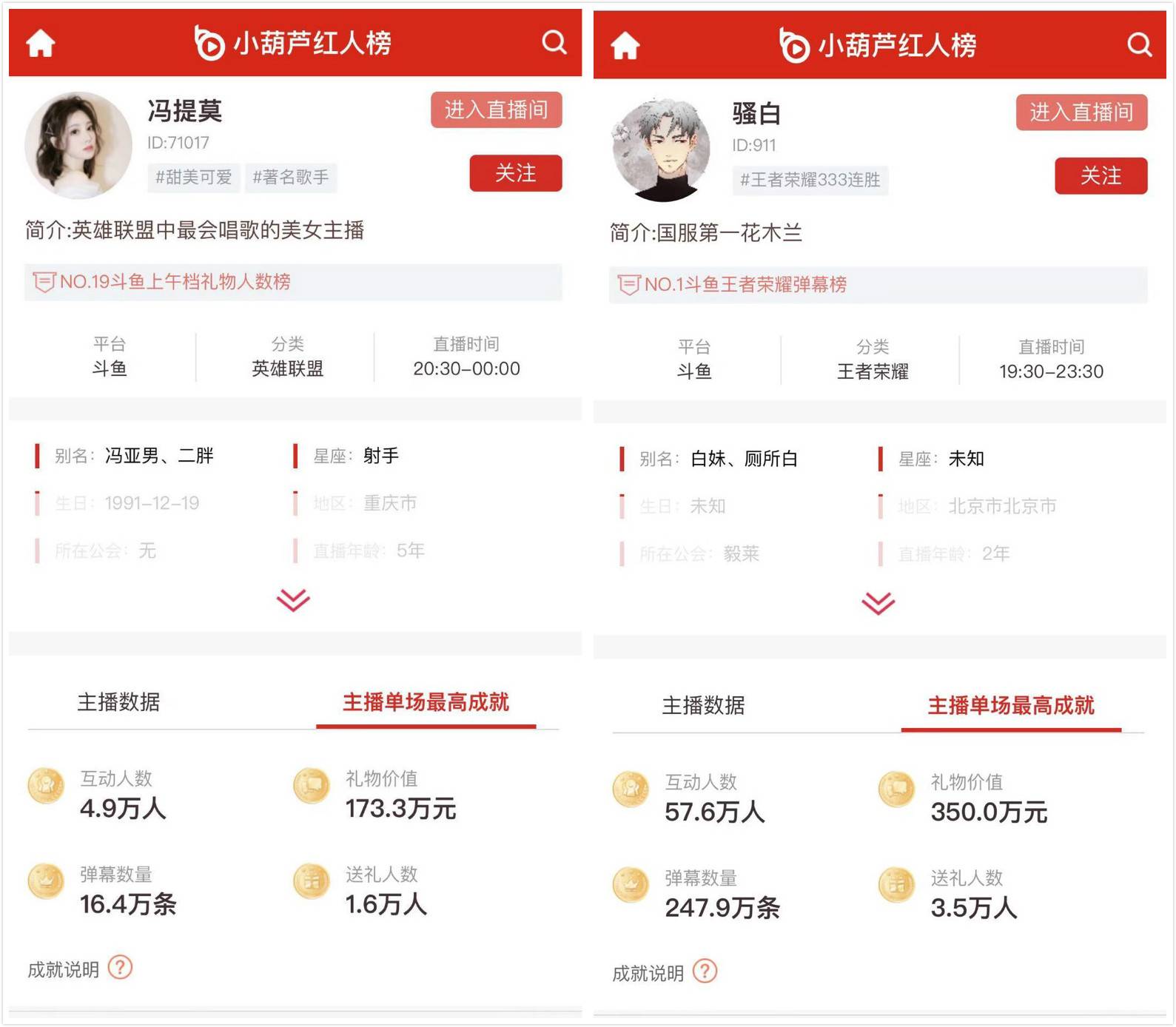 据主播大数据平台小葫芦红人榜的统计显示,在主播单场最高成就中,冯提莫的礼物人数榜排名仅是NO.19,互动人数、礼物价值、弹幕数量、送礼人数都表现平平。