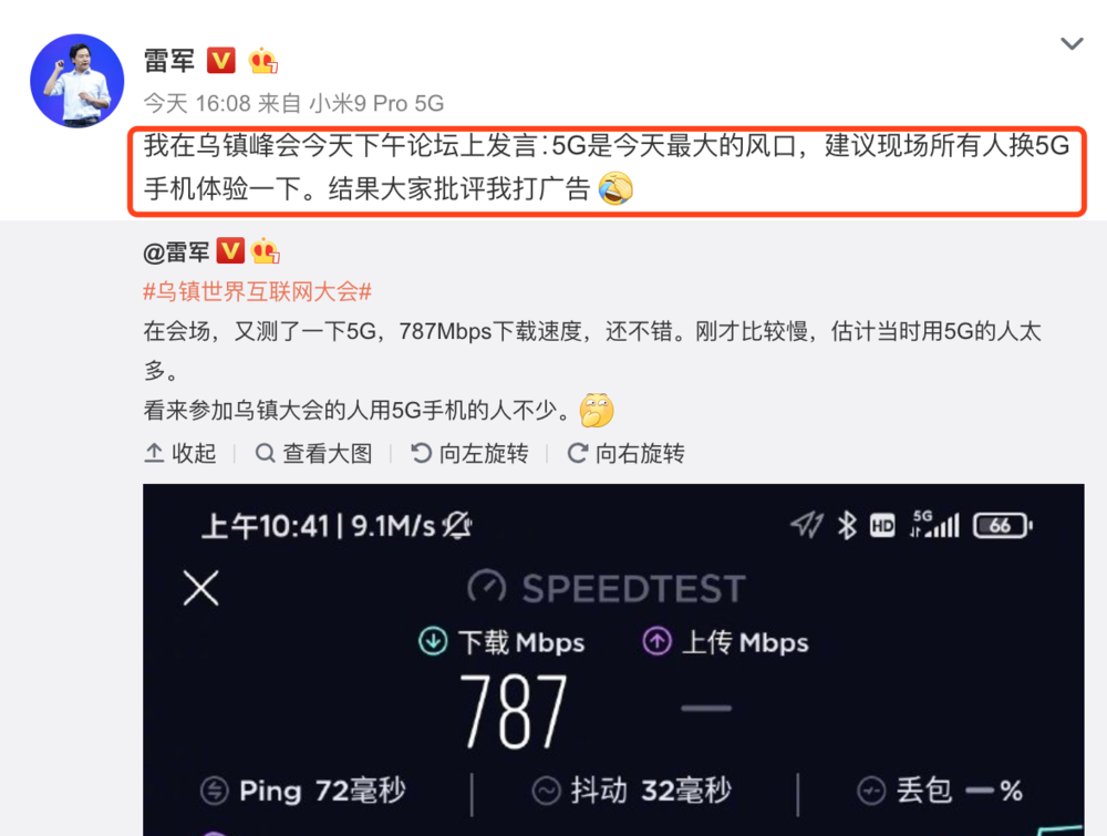 雷军从昨晚到今天的每条微博都是测5G网速: