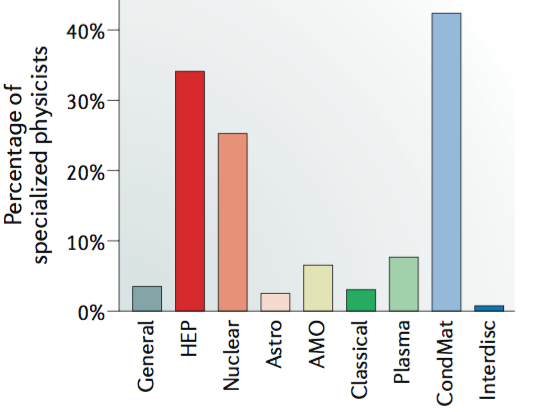 各个分支之间,科学家人数的比例差别较大。研究高能物理和跨学科物理的科学家人数相当,但是专门研究高能物理学的比例要多很多。跨学科物理(Interdisc)包括应用型的计算物理,比如计算生物物理、复杂系统等。
