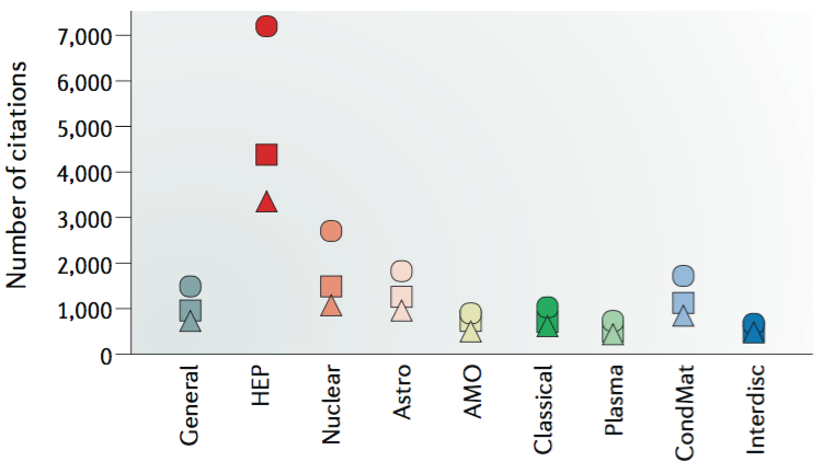 该文用累计引文数衡量分支的影响力。不管是从论文还是引文数量的角度来说,高能物理是最有影响力的分支。