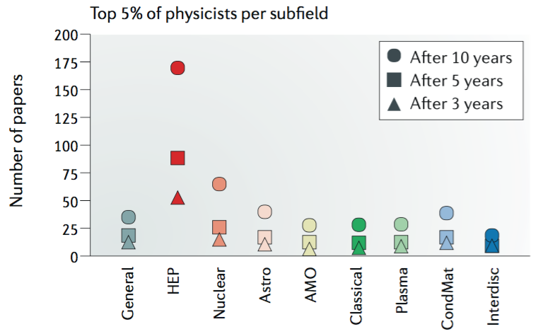 Nature Physics Reviews 今年1月份发的文章筛选并分析了从1985年到2015年发表的约五百六十万篇物理学论文,135877位物理学家。这些物理学家在30年内至少有5篇论文发表。文章指出,大部分物理学家只从三个分支开始他们的职业生涯,并且不同物理学分支有不同的合作模式,进而造成子领域之间论文产量和影响力的区别。