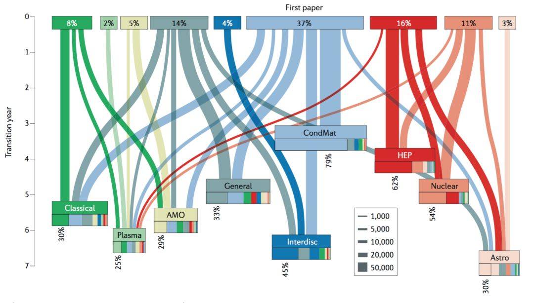 我们看到37%的物理学家第一篇论文发表在凝聚态物理领域,逐渐分化到跨学科物理,天体物理等领域。