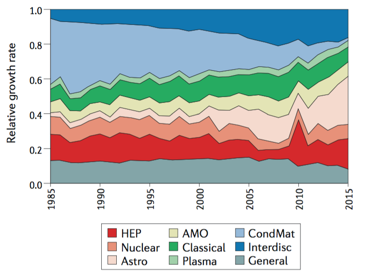 Nature Physics Reviews今年1月份发的文章Taking census of physics分析了从1985年到2015年发表的约五百六十万篇物理学论文,135877位物理学家,发现大部分物理学家只从三个分支开始他们的职业生涯,并且不同物理学分支有不同的合作模式,进而造成子领域之间论文产量和影响力的区别。