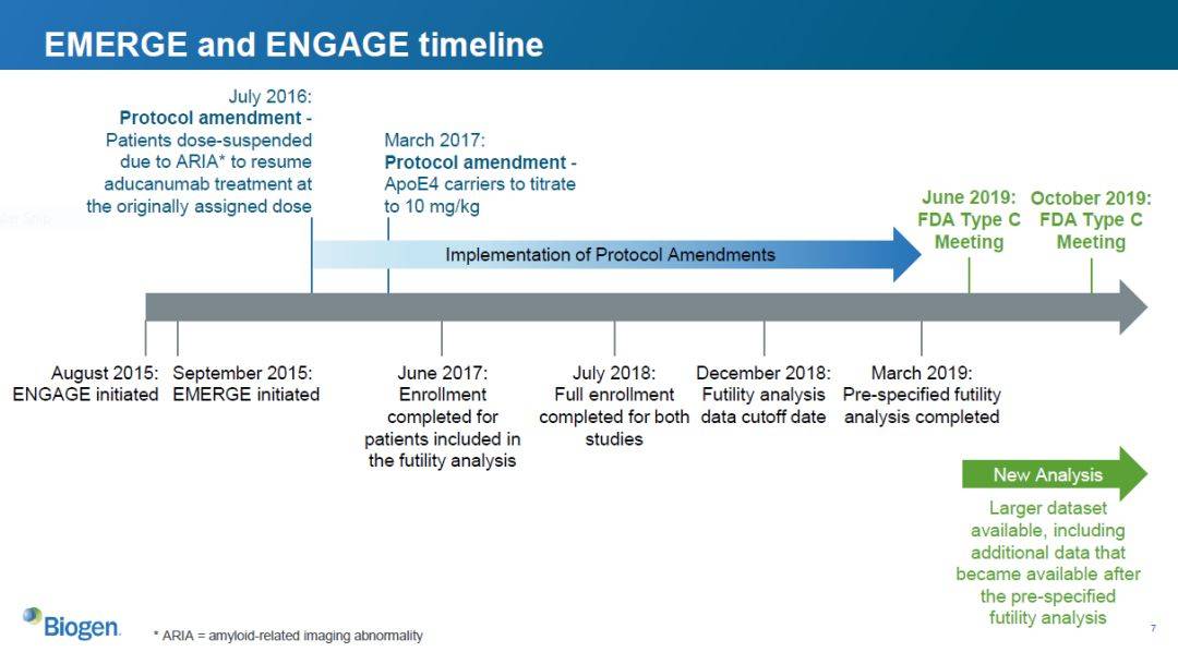 在2015年8月和9月,渤健启动了两项3期临床试验,分别名为ENGAGE和EMERGE。这些临床试验招募的是因为AD出现轻微认知障碍的早期患者,通过PET扫描证实,这些患者的大脑中β淀粉样蛋白水平升高。他们分别接受了三种不同剂量aducanumab的治疗(3mg/kg、6mg/kg、10mg/kg)。