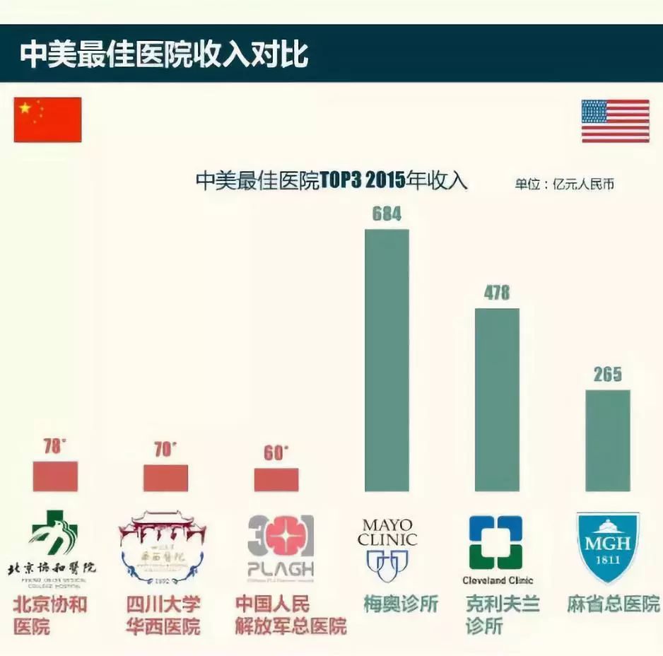 (中美最佳医院的营收对比(2015年)中国医院收入为非官方数据,仅供参考)