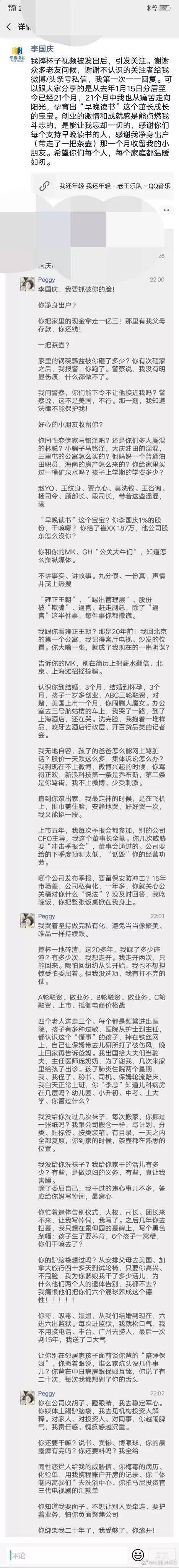 朋友圈的截图显示,昨日即23日晚上,俞渝突然在李国庆19日转发的一条朋友圈下长文留言,称李国庆拿走一亿三,并非净身出户,并爆出李国庆诸多私生活猛料,并放话:“李国庆,我要抓破你的脸。”