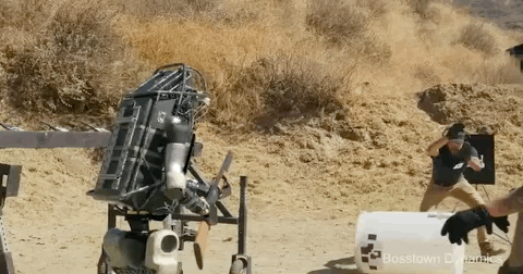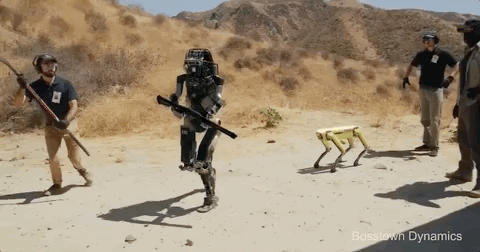 但测试人员用武力逼迫,棍棒砸向机器人。机器人忍无可忍,一脚把人类的棍棒踹飞,向人类开枪警示,最后抱起机器狗逃之夭夭: