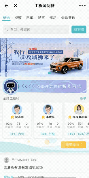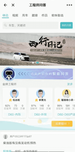 点开“金牌工程师”——“更多”,可以看到所有工程师的姓名、回复率、回复数和各自负责的细分领域。顶部的菜单不仅按照车型进行了分类,也根据不同专业领域进行了划分,方便用户快速找到想要的类别和信息。我想用过这个功能的用户肯定能体会到上汽大通“蜘蛛智选”的不同之处和诚意。
