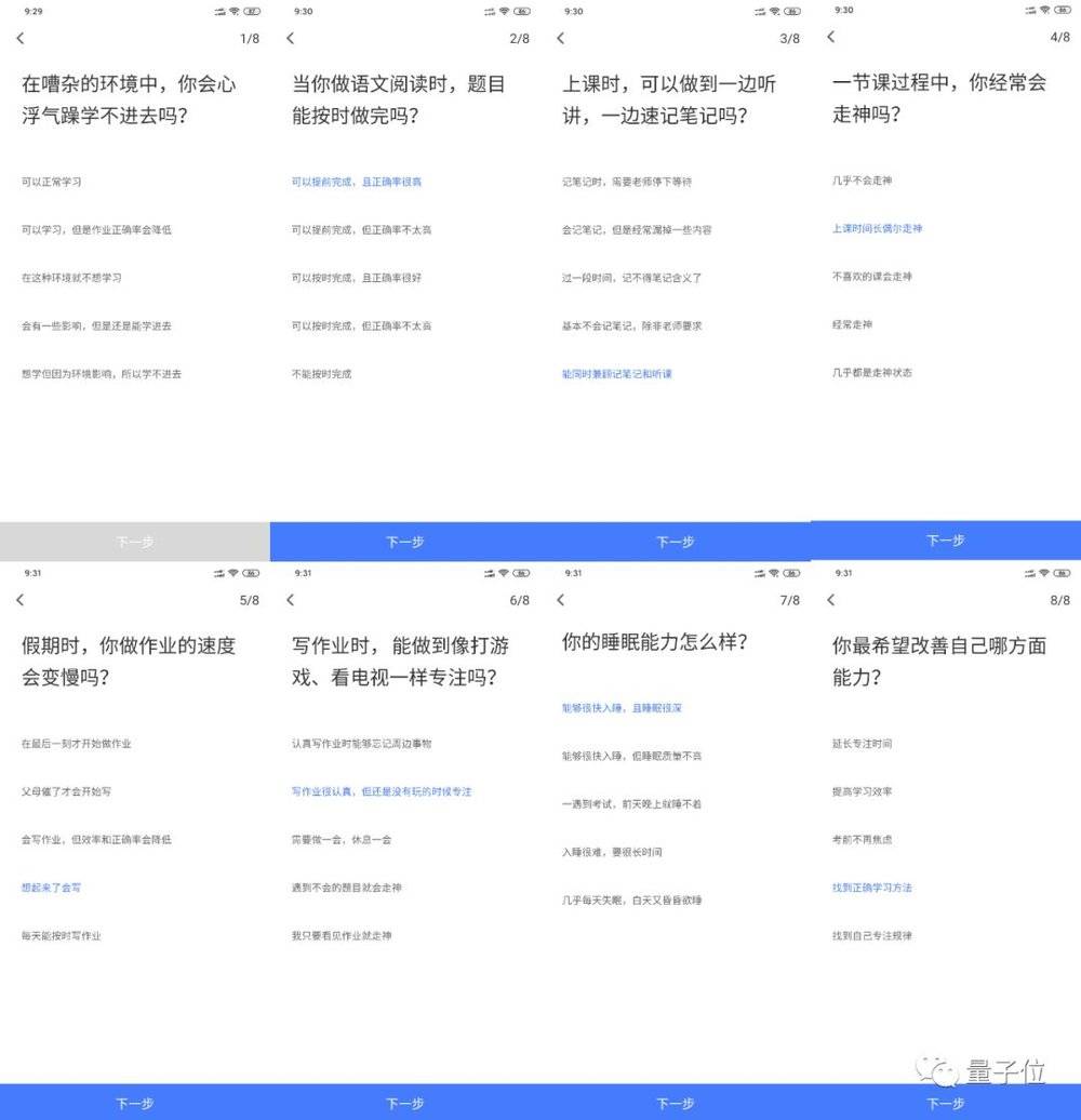 第一次登陆的时候需要进行“专注力及学习能力评估”,回答8个问题: