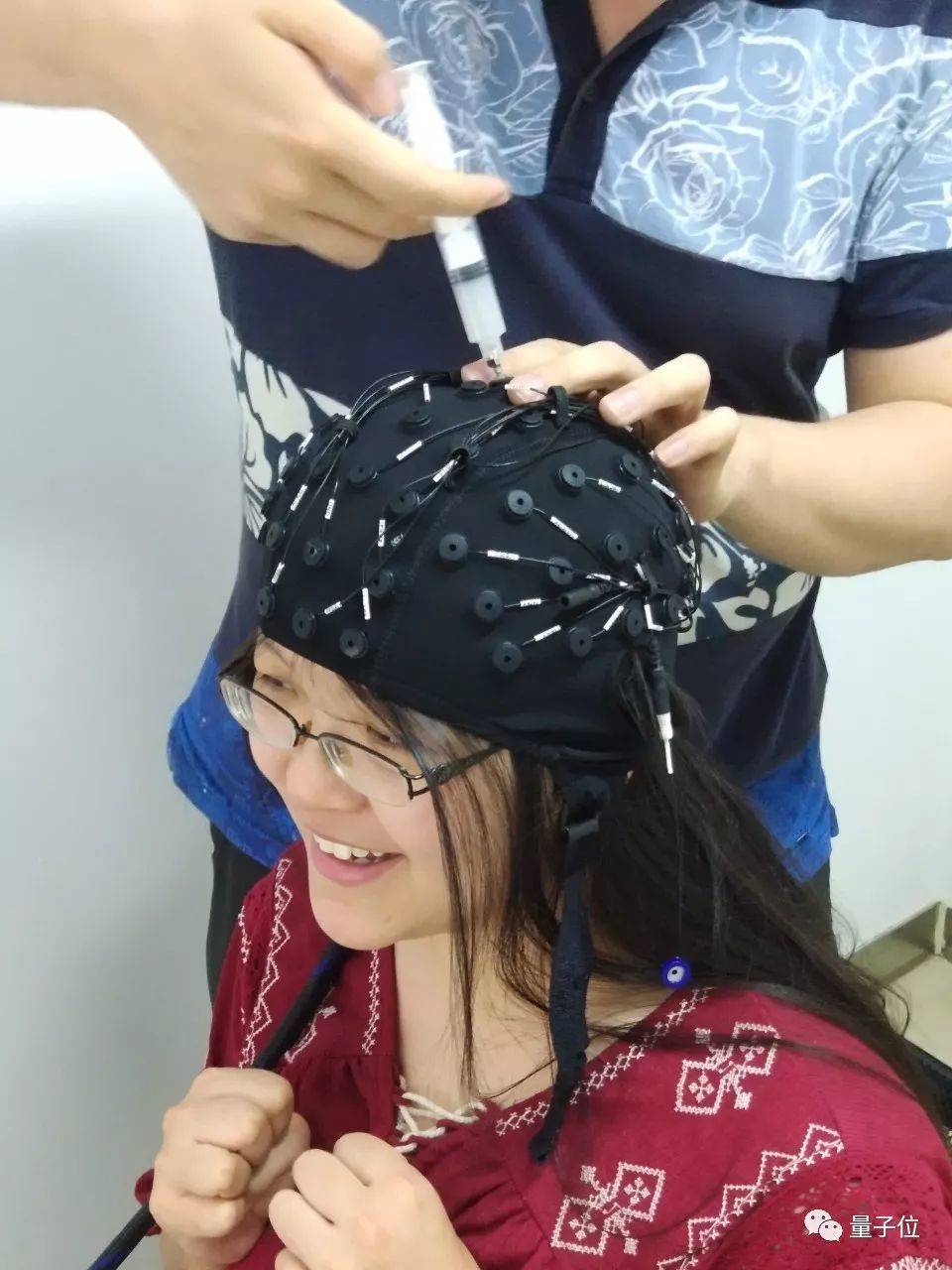 而之前量子位去清华体验脑机接口的时候,戴的头套可是密密麻麻布满了电极。