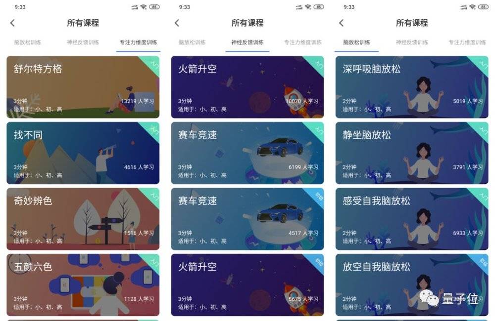 除了这些被加入训练计划的课程之外,还有“脑放松训练”“神经反馈训练”“专注力维度训练”三个类型的课程: