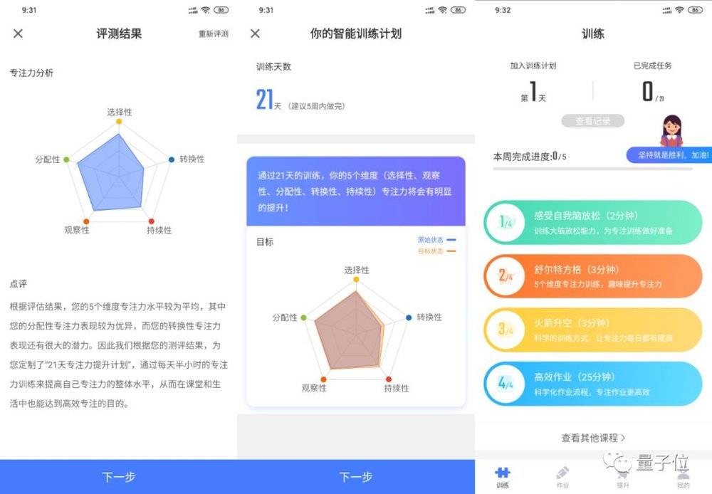之后,系统会给出一个“专注力”分析报告,并给出“训练计划”,然后就进入了今日训练课程: