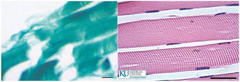 左:“辛追夫人”的肌肉组织在显微镜下仍能清晰看见肌纤维横纹;右:新鲜骨骼肌镜下照片|参考文献[7]