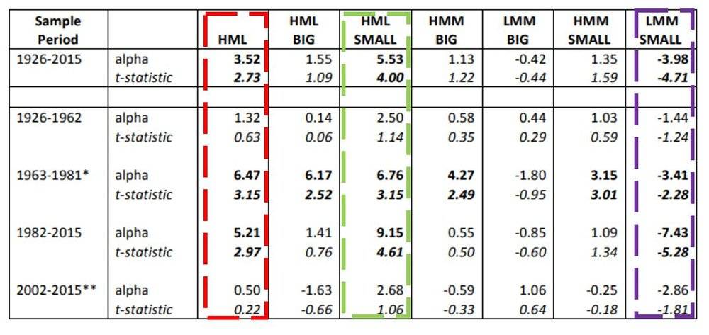 HML价值因子的溢价并不总是显著的(红框所示)。HML列是完整HML价值因子在不同时间段的超额收益。全时段的1926-2015来看,该因子具有显著的正超额收益。但分时段来看,1926-1962和2002-2015两个时间段的超额收益并不显著。